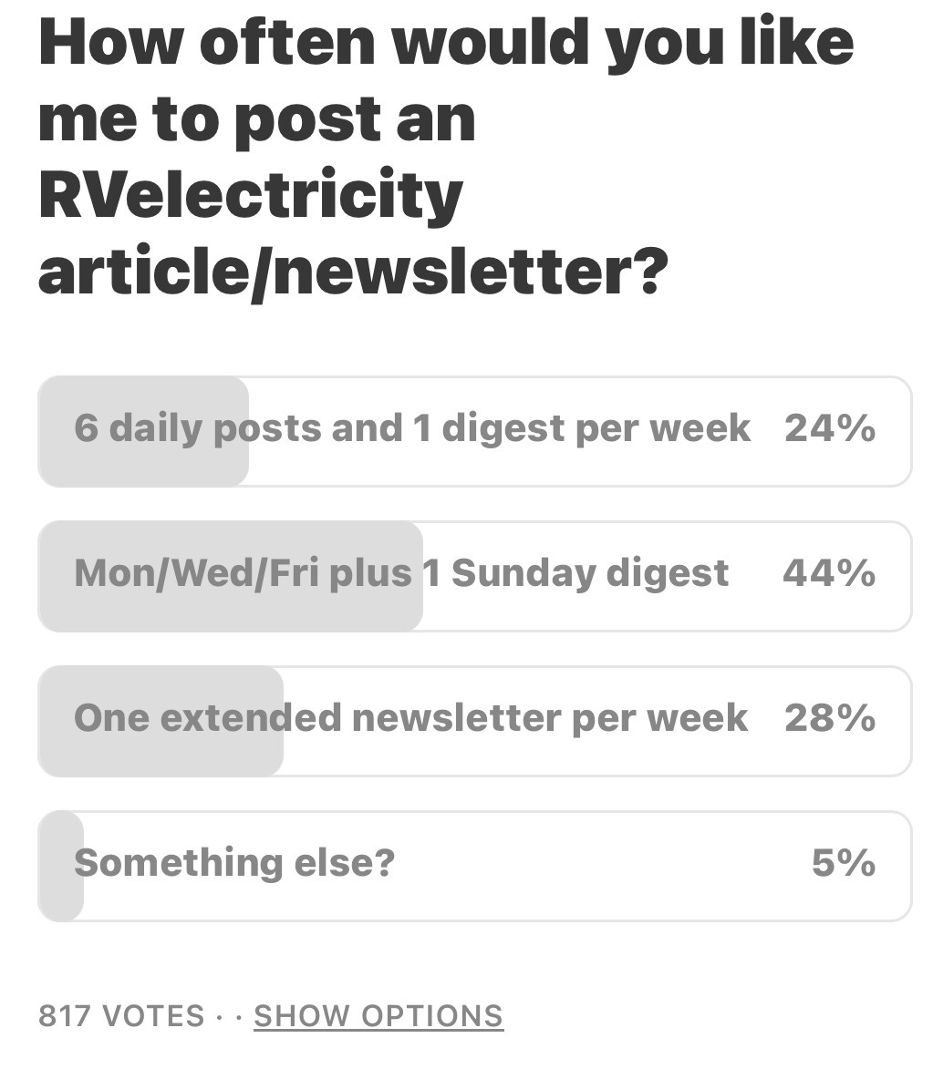 The times they are a changing! Due to popular demand I’m changing my RVelectricity postings from 6+1 days a week, to 3+1 days a week. As you can see from the poll I took last week, 44% of readers want me to post articles on Mon/Wed/Fri with a Sunday digest. So I’ll try this for a few months and see how it goes.